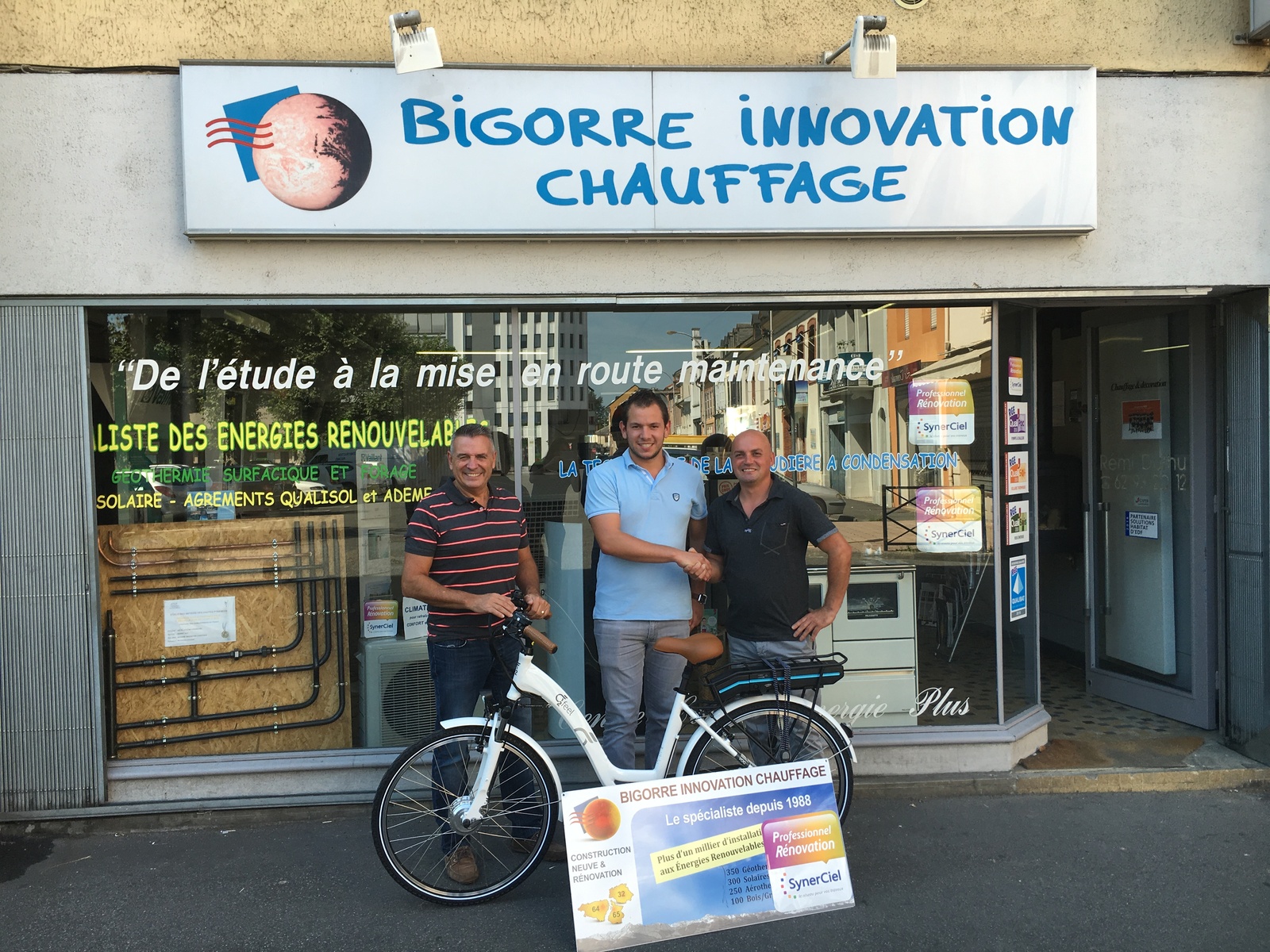 Boris LASMARRIGUES, Gérant de Bigorre Innovation Chauffage, remet 1 vélo électrique à M. BECK dans le cadre du challenge SYNERCIEL.
